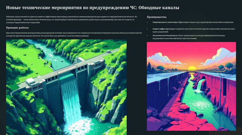 Новые технические мероприятия по предупреждению ЧС: Обводные каналыОбводные каналы являются одним из наиболее эффективных инженерных решений для минимизации рисков при авариях на гидродинамических объектах. Их