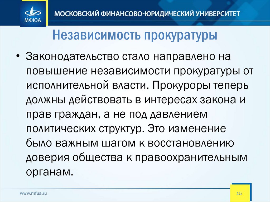 • Законодательство стало направлено наповышение независимости прокуратуры от