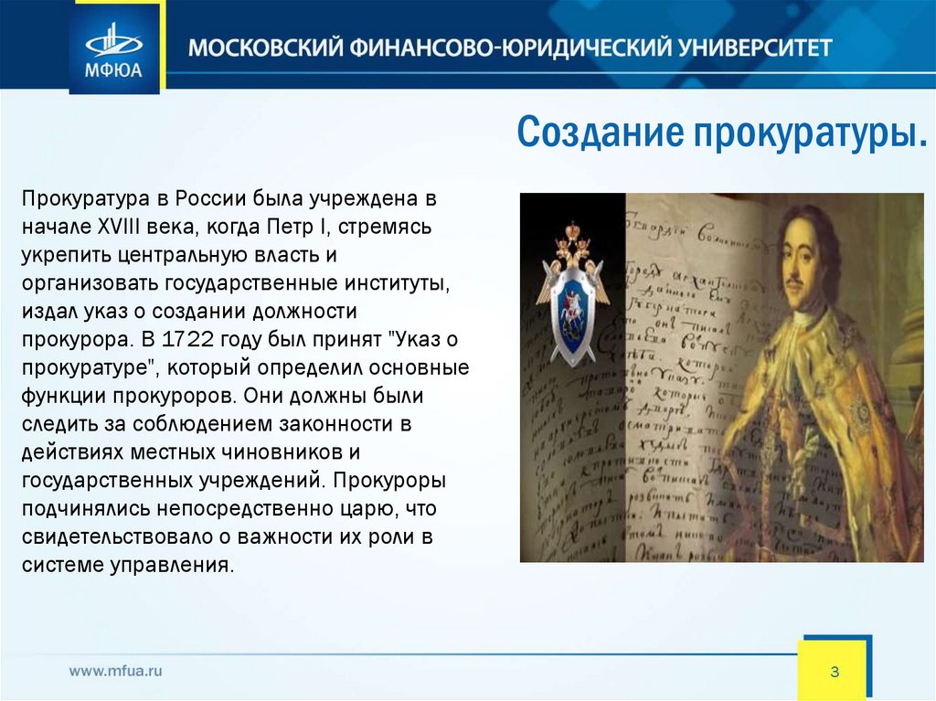 Прокуратура в России была учреждена вначале XVIII века, когда Петр I, стремясь