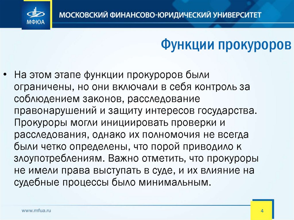 • На этом этапе функции прокуроров былиограничены, но они включали в себя контроль за