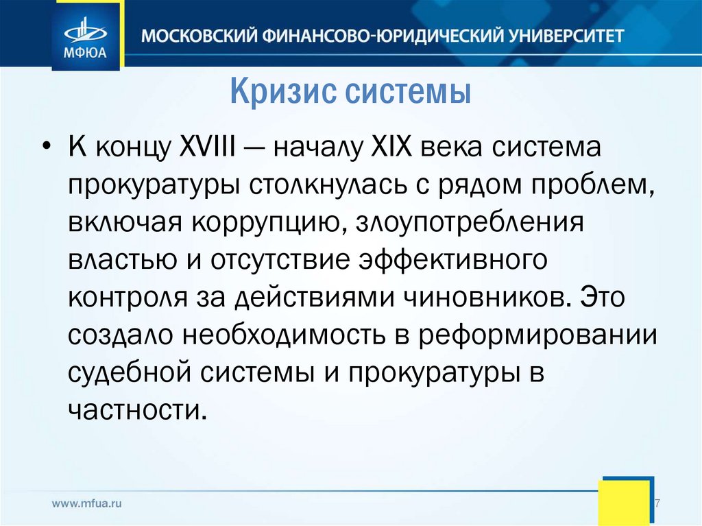 • К концу XVIII — началу XIX века системапрокуратуры столкнулась с рядом проблем,