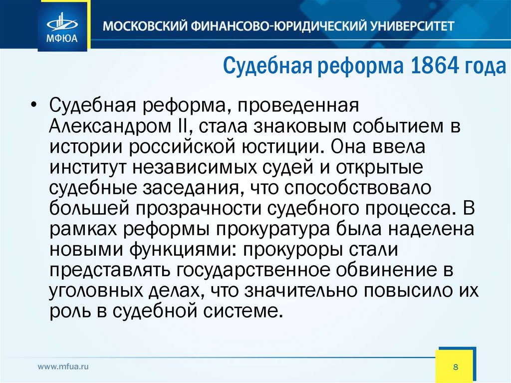 • Судебная реформа, проведеннаяАлександром II, стала знаковым событием в