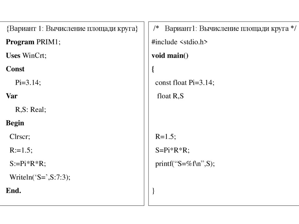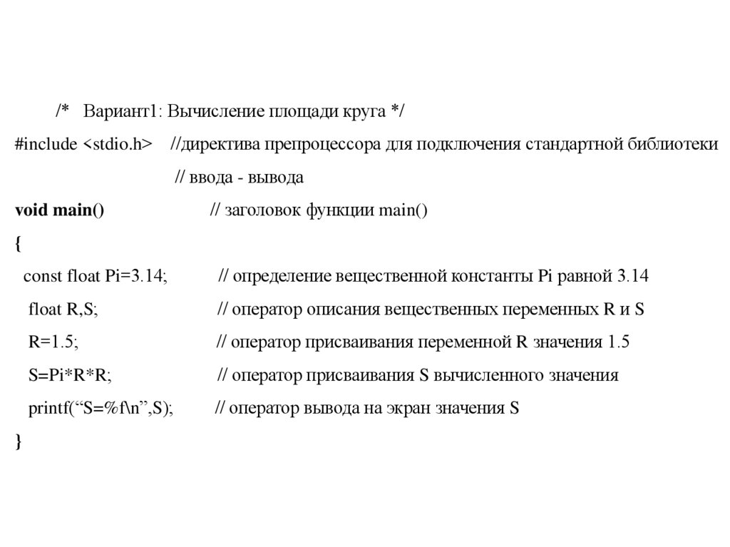 /* Вариант1: Вычисление площади круга */#include <stdio.h> //директива препроцессора для подключения стандартной библиотеки