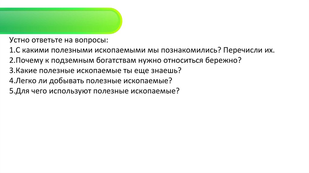 Устно ответьте на вопросы:1.С какими полезными ископаемыми мы познакомились? Перечисли их.