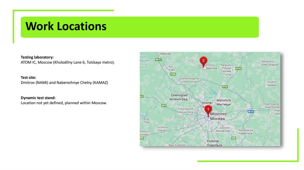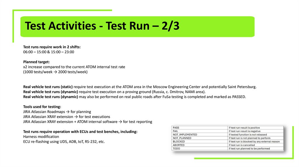 Real vehicle test runs (static) require test execution at the ATOM area in the Moscow Engineering Center and potentially Saint Petersburg.