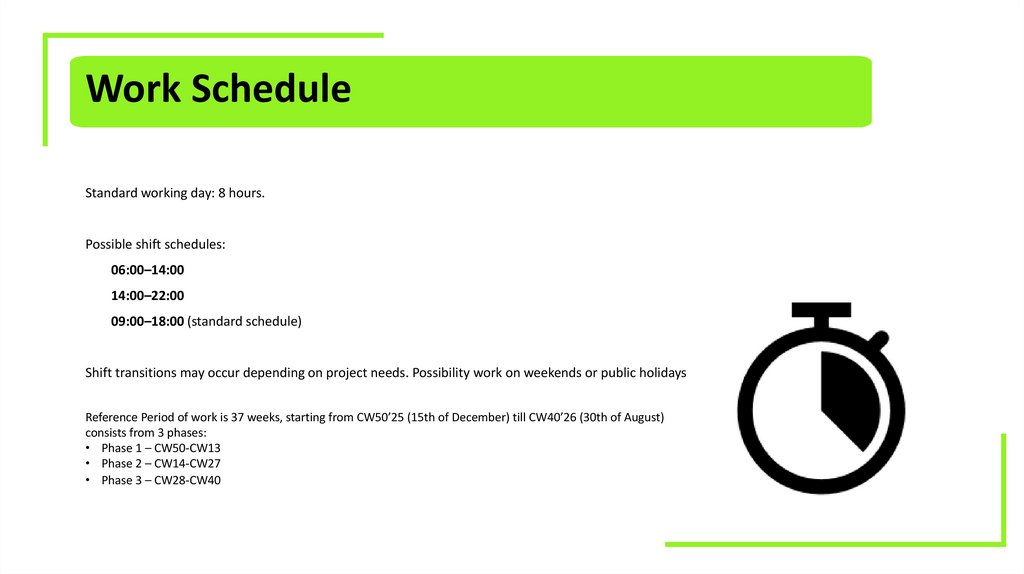 Reference Period of work is 37 weeks, starting from CW50’25 (15th of December) till CW40’26 (30th of August)