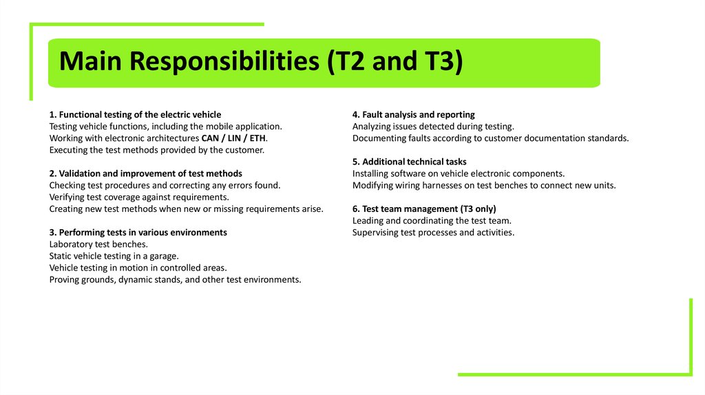 Main Responsibilities (T2 and T3)1. Functional testing of the electric vehicle
