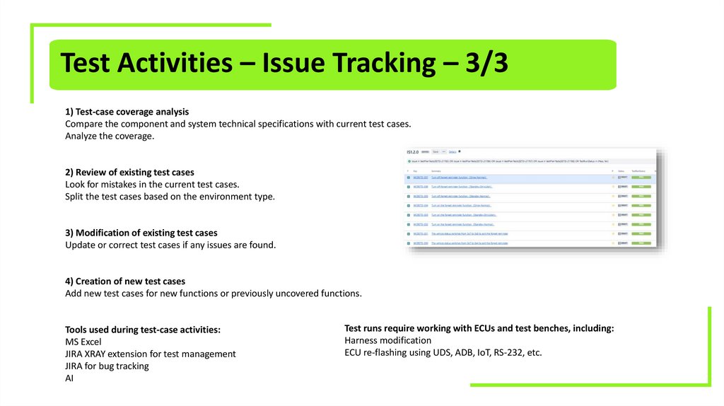 Test Activities – Issue Tracking – 3/31) Test-case coverage analysis