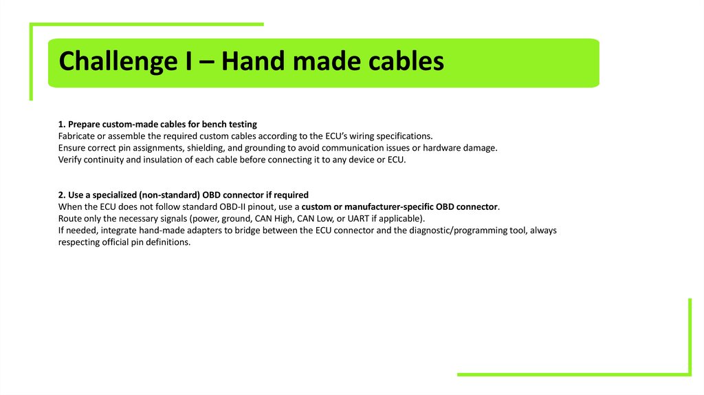 Challenge I – Hand made cables1. Prepare custom-made cables for bench testing