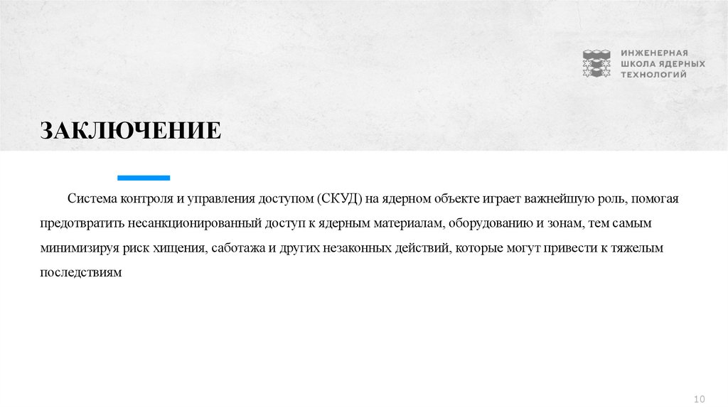 ЗАКЛЮЧЕНИЕСистема контроля и управления доступом (СКУД) на ядерном объекте играет важнейшую роль, помогая