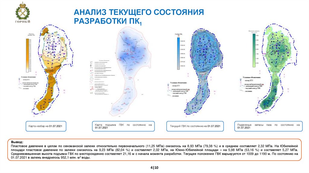 Средневзвешенная высота подъема ГВК по месторождению составляет 21,16 м с начала момента разработки. Текущее положение ГВК варьируется от 1009 до 1190 м. По состоянию на