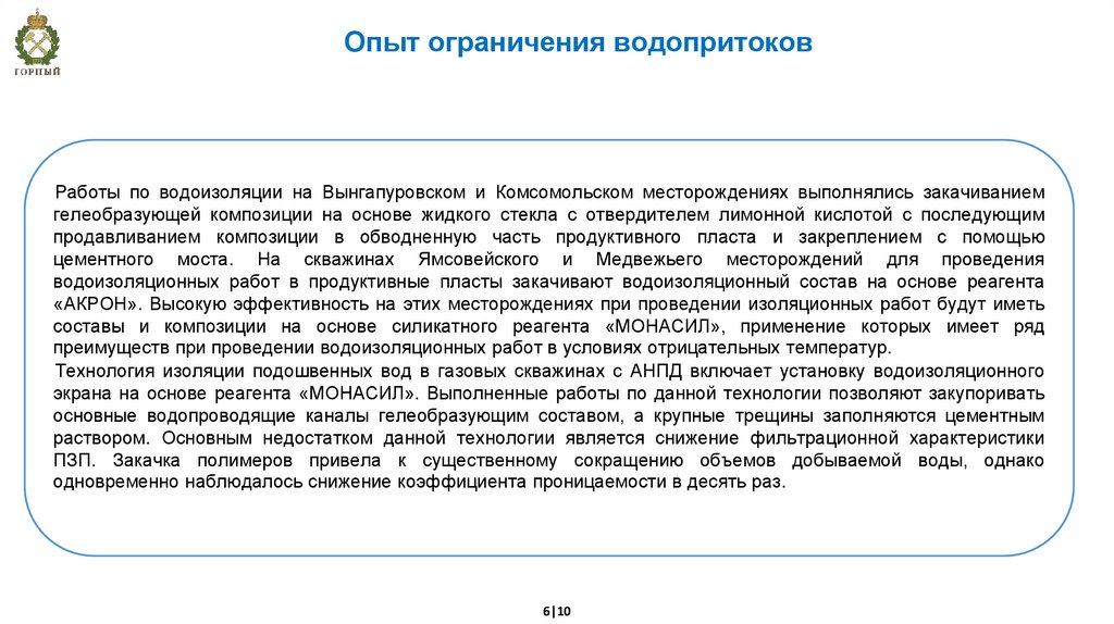 Опыт ограничения водопритоковРаботы по водоизоляции на Вынгапуровском и Комсомольском месторождениях выполнялись закачиванием