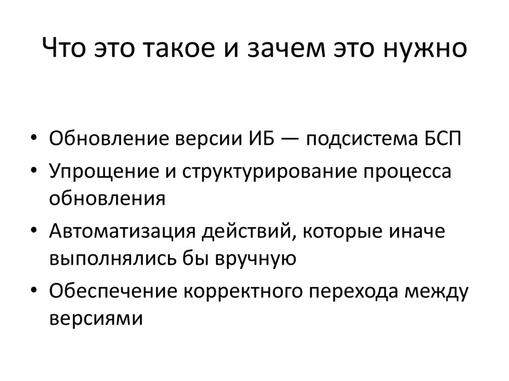 Что это такое и зачем это нужно• Обновление версии ИБ — подсистема БСП