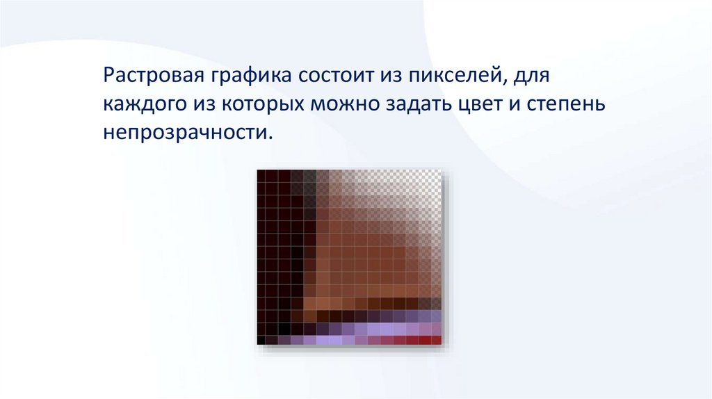 Растровая графика состоит из пикселей, длякаждого из которых можно задать цвет и степень