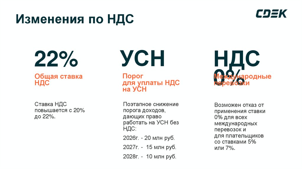 • повышение ставки НДС до 22%• кардинальные изменения работы на УСН