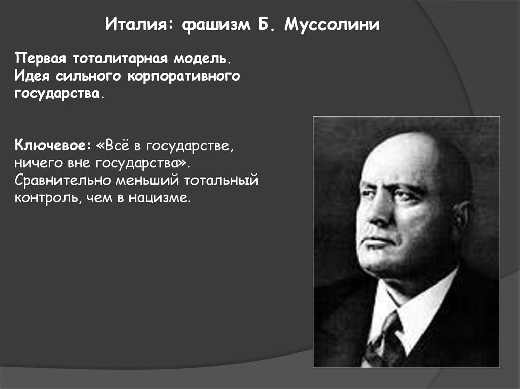 Италия: фашизм Б. МуссолиниПервая тоталитарная модель.