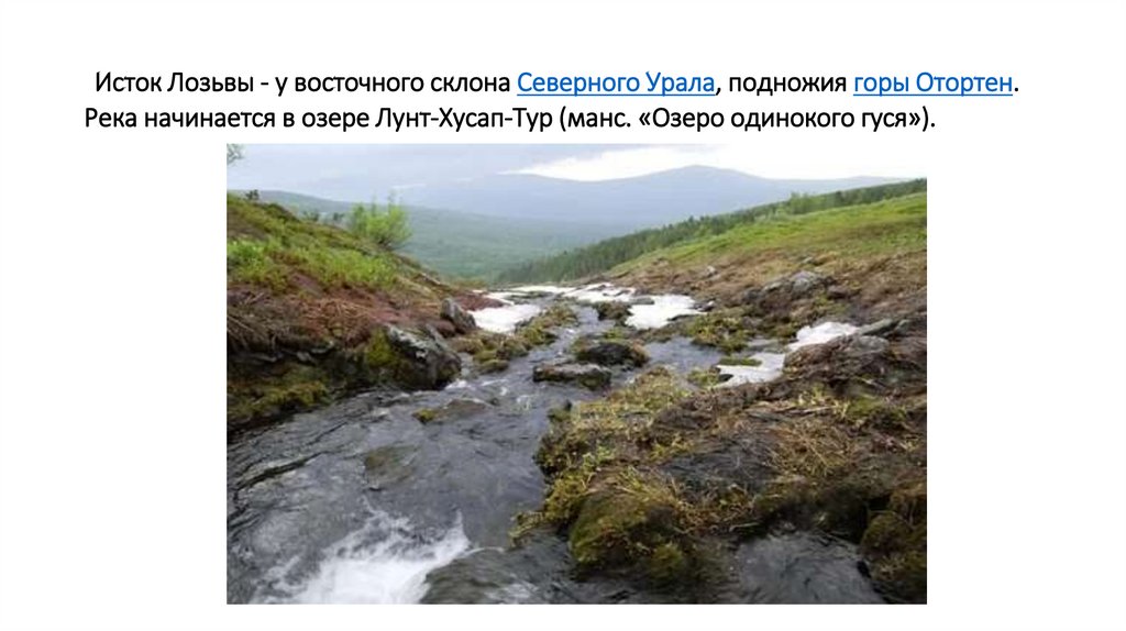 3. Исток Лозьвы - у восточного склона Северного Урала, подножия горы Отортен. Река начинается в озере Лунт-Хусап-Тур (манс. «Озеро