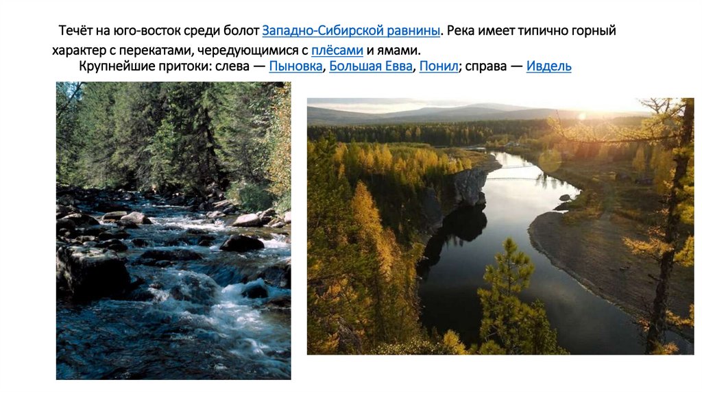 4. Течёт на юго-восток среди болот Западно-Сибирской равнины. Река имеет типично горный характер с перекатами, чередующимися