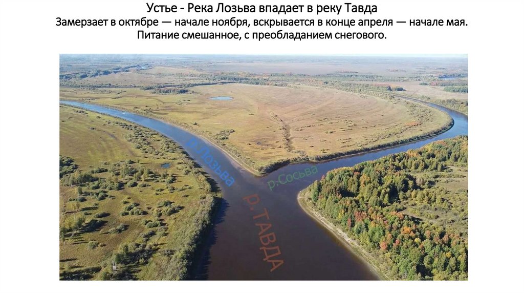 5. Устье - Река Лозьва впадает в реку Тавда Замерзает в октябре — начале ноября, вскрывается в конце апреля — начале мая. Питание