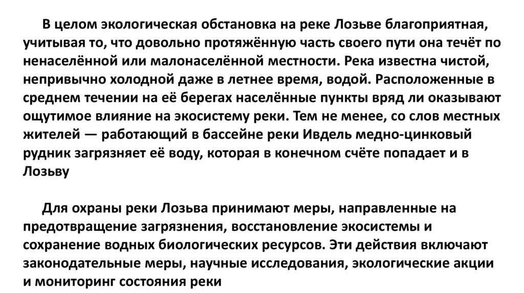 В целом экологическая обстановка на реке Лозьве благоприятная,учитывая то, что довольно протяжённую часть своего пути она течёт по