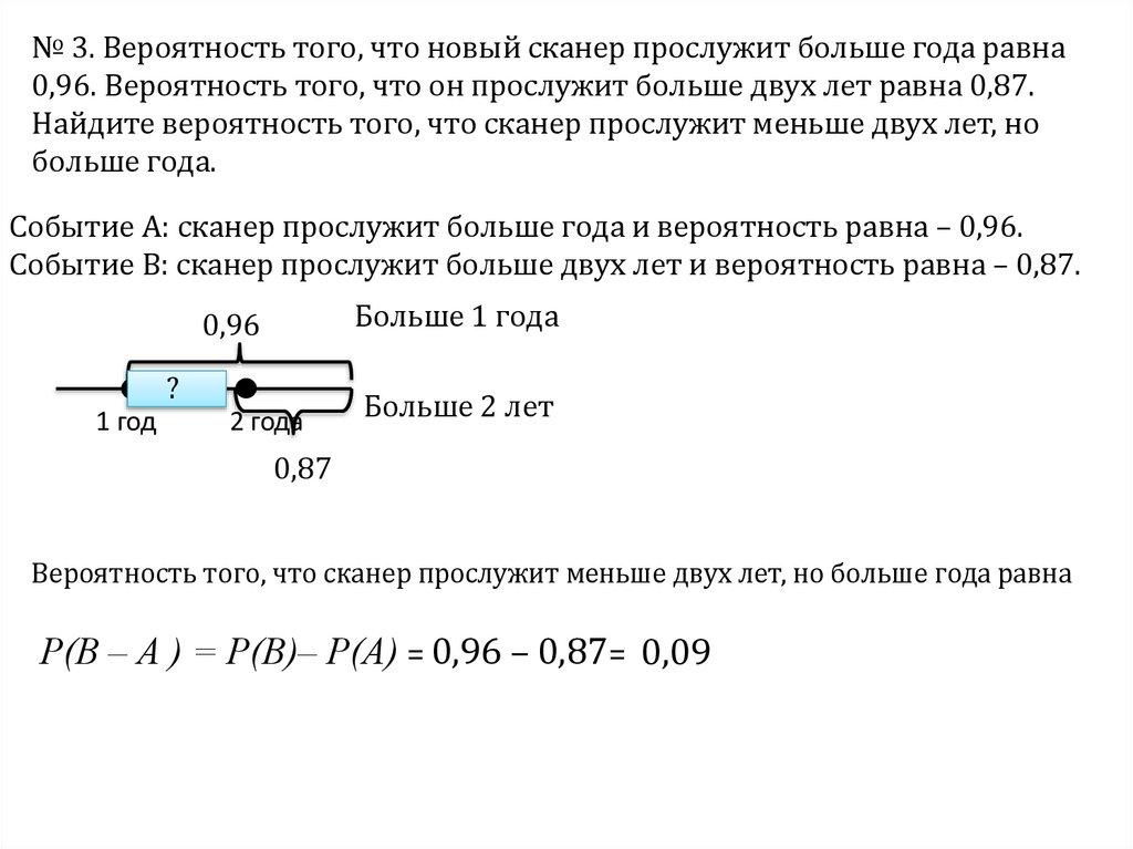 Р(В – А ) = Р(В)– Р(А) = 0,96 – 0,87= 0,09