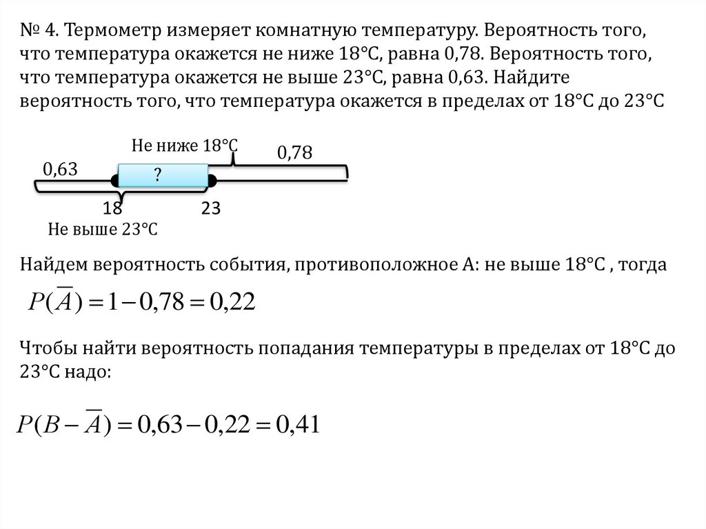 № 4. Термометр измеряет комнатную температуру. Вероятность того,что температура окажется не ниже 18°С, равна 0,78. Вероятность того,