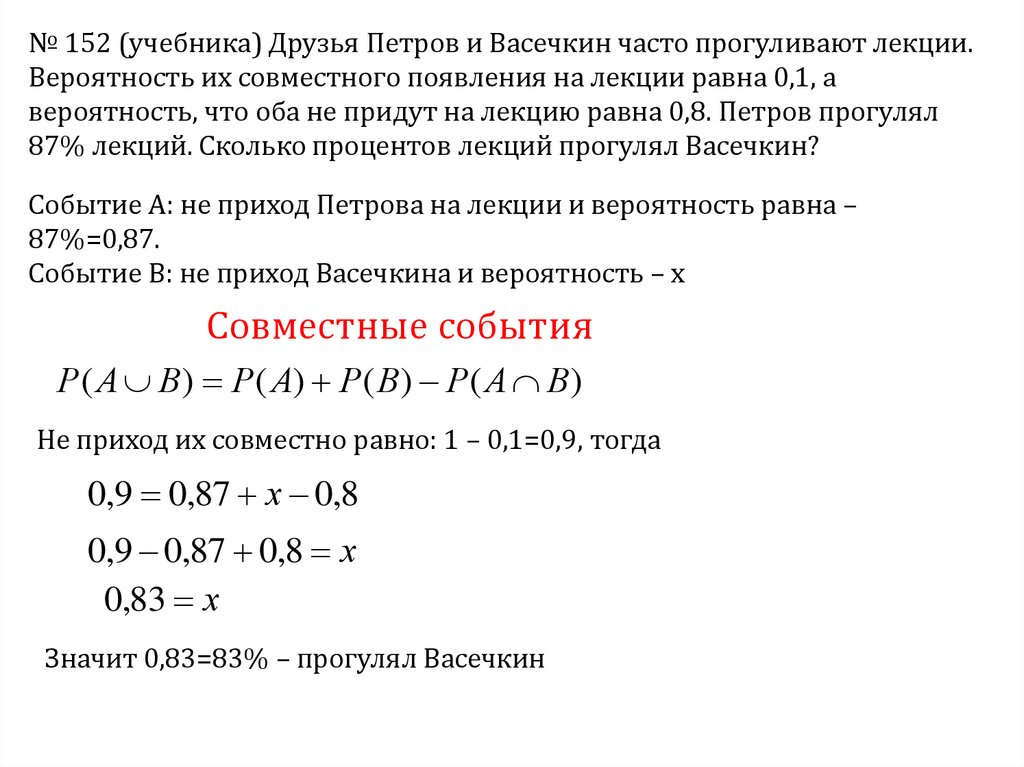 № 152 (учебника) Друзья Петров и Васечкин часто прогуливают лекции.Вероятность их совместного появления на лекции равна 0,1, а
