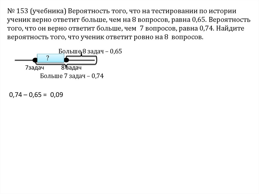 № 153 (учебника) Вероятность того, что на тестировании по историиученик верно ответит больше, чем на 8 вопросов, равна 0,65. Вероятность