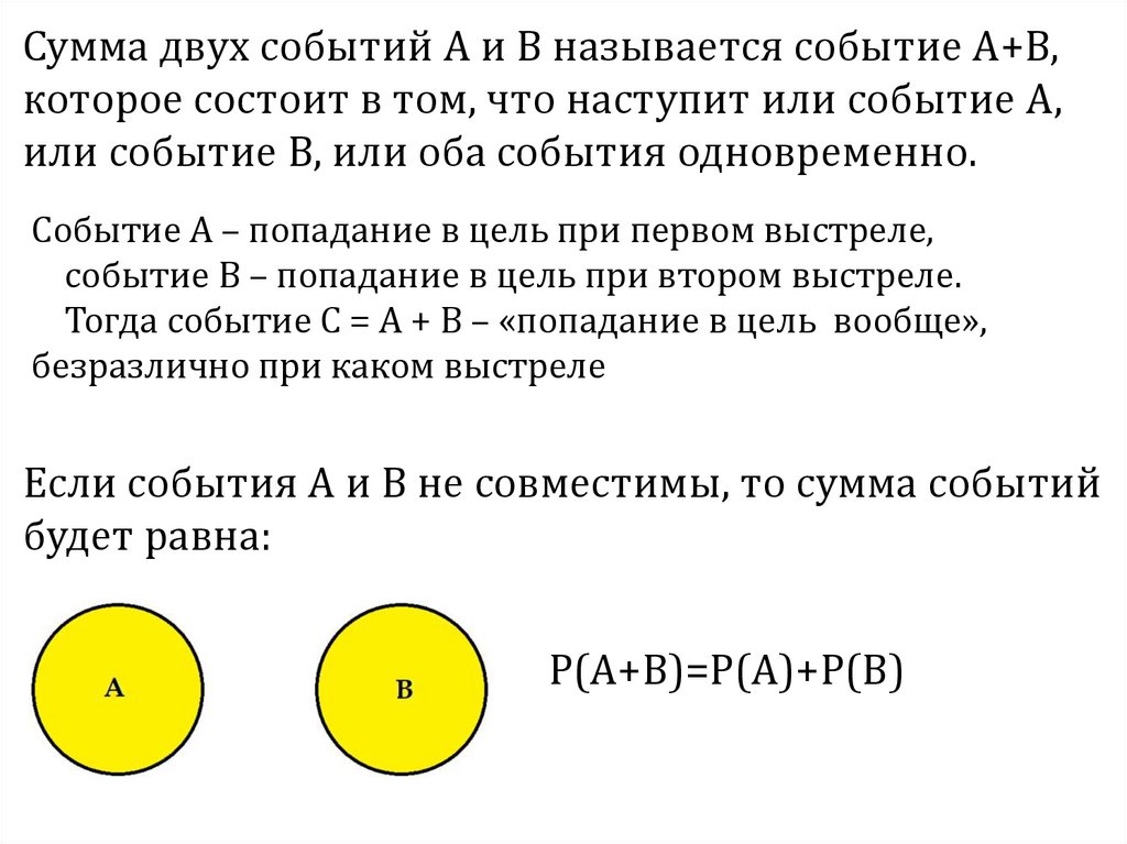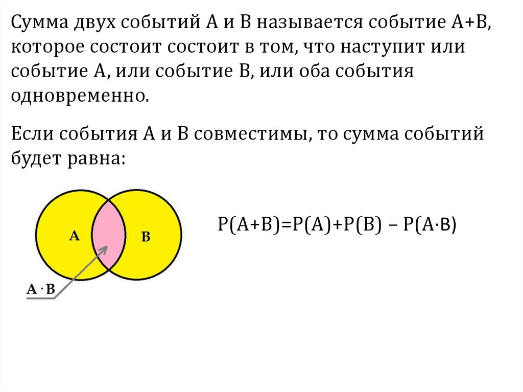 Сумма двух событий А и В называется событие А+В,которое состоит состоит в том, что наступит или