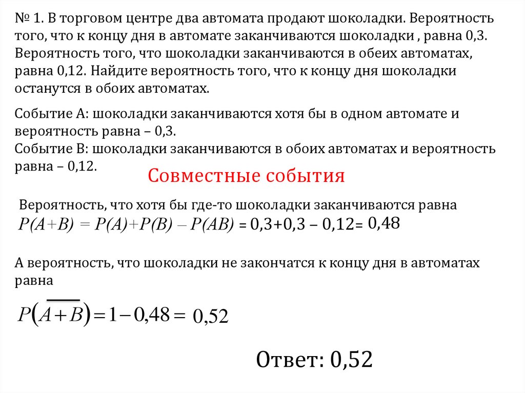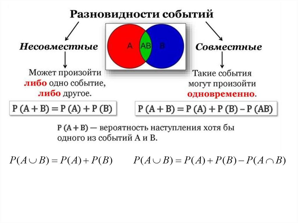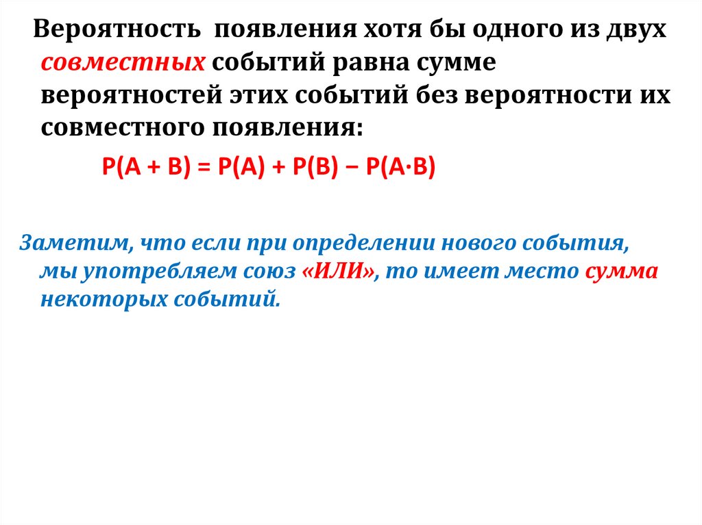 Р(А+В)=Р(А)+Р(В) – Р(А∙В)