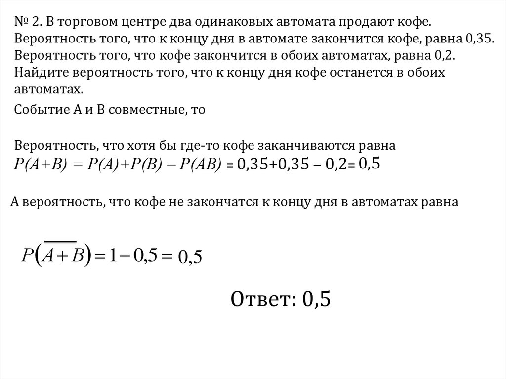 № 2. В торговом центре два одинаковых автомата продают кофе.Вероятность того, что к концу дня в автомате закончится кофе, равна 0,35.