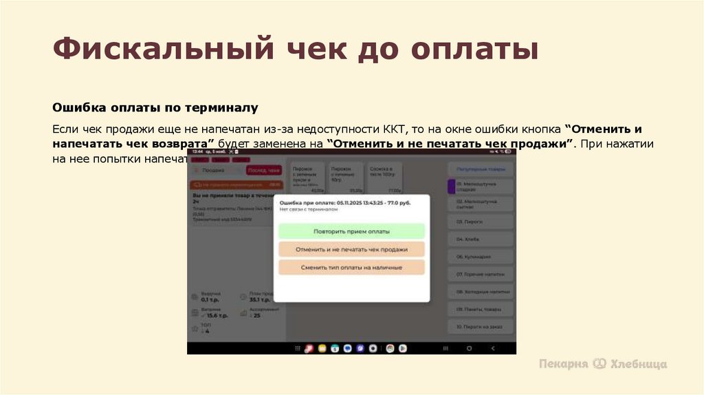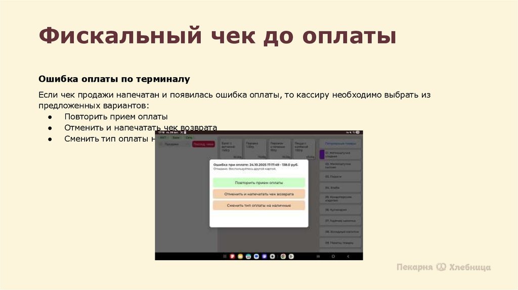 Фискальный чек до оплатыОшибка оплаты по терминалу