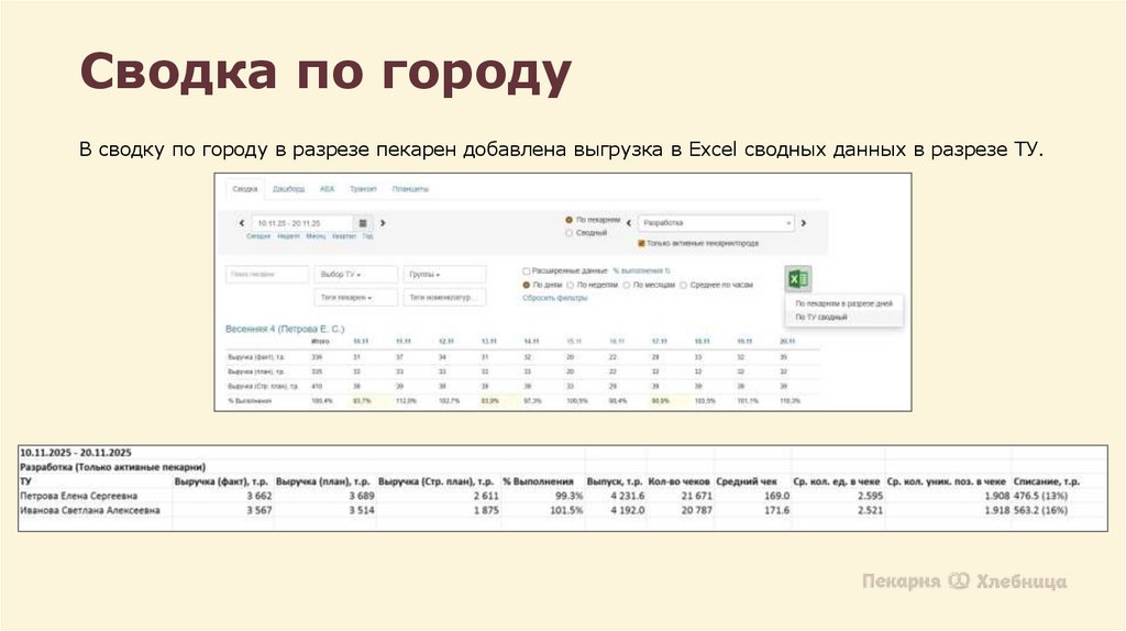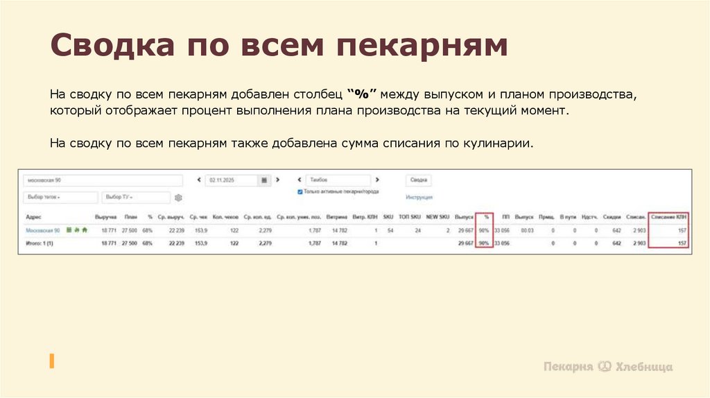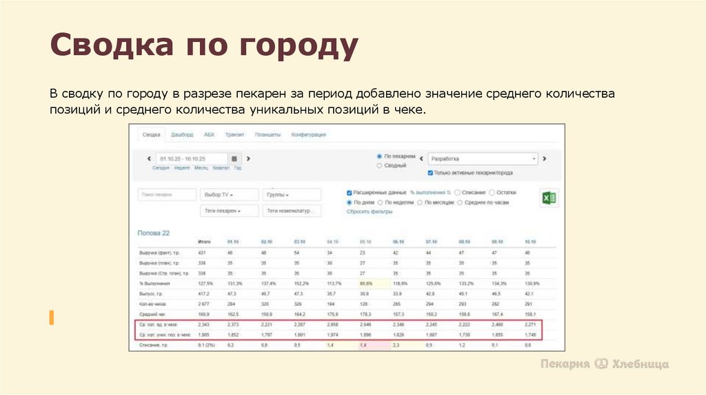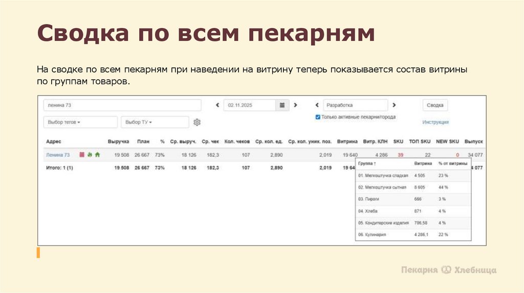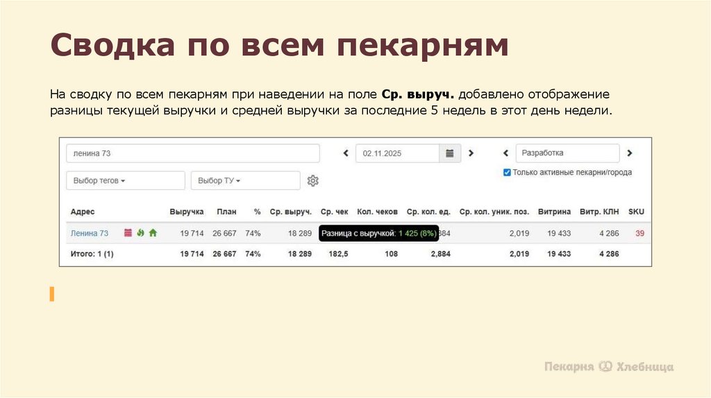 Сводка по всем пекарнямНа сводку по всем пекарням при наведении на поле Ср. выруч. добавлено отображение