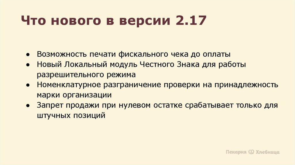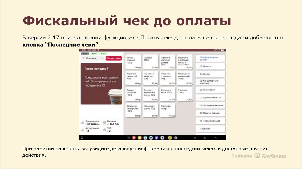 Что нового в версии 2.17● Возможность печати фискального чека до оплаты