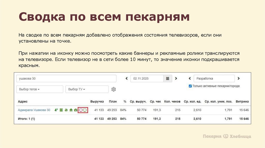 Сводка по всем пекарнямНа сводке по всем пекарням добавлено отображения состояния телевизоров, если они