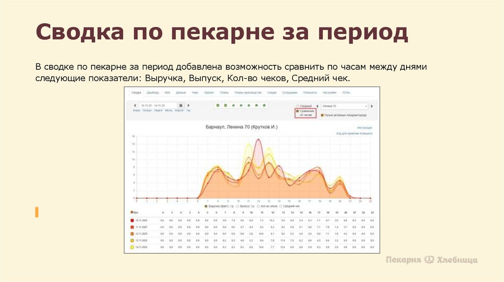 Сводка по пекарне за периодВ сводке по пекарне за период добавлена возможность сравнить по часам между днями