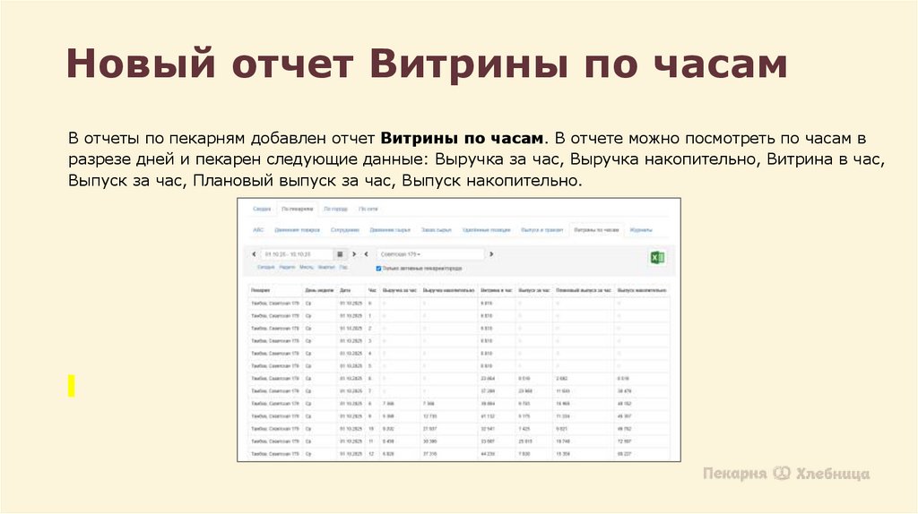 Новый отчет Витрины по часамВ отчеты по пекарням добавлен отчет Витрины по часам. В отчете можно посмотреть по часам в