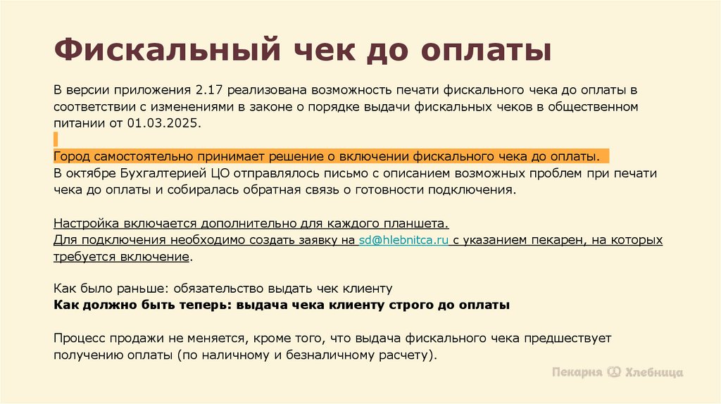 Фискальный чек до оплатыВ версии приложения 2.17 реализована возможность печати фискального чека до оплаты в