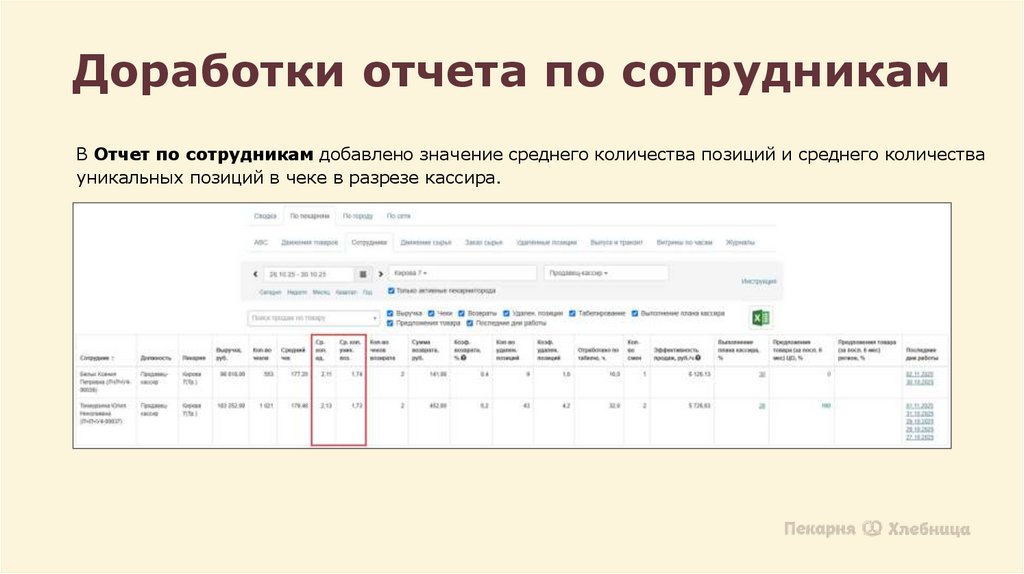 Доработки отчета по сотрудникамВ Отчет по сотрудникам добавлено значение среднего количества позиций и среднего количества