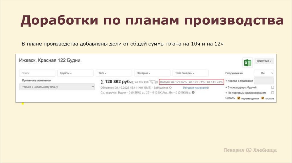 Доработки по планам производстваВ плане производства добавлены доли от общей суммы плана на 10ч и на 12ч