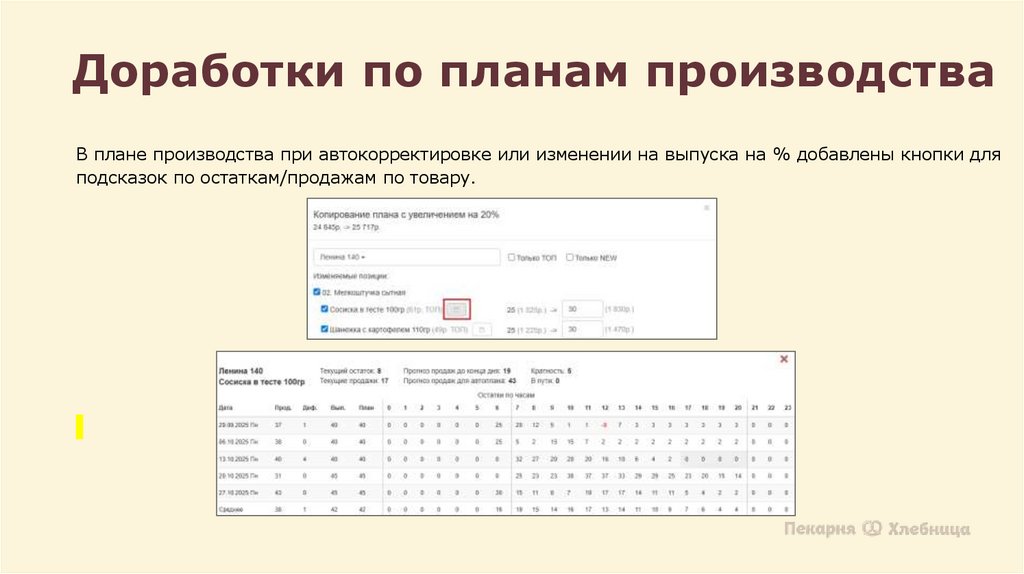 Доработки по планам производстваВ плане производства при автокорректировке или изменении на выпуска на % добавлены кнопки для