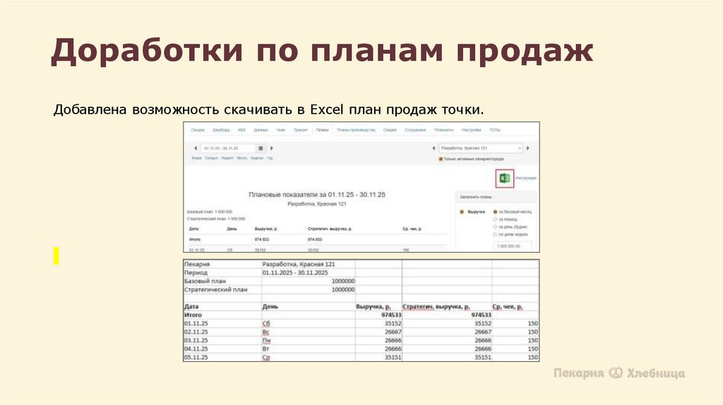 Доработки по планам продажДобавлена возможность скачивать в Excel план продаж точки.