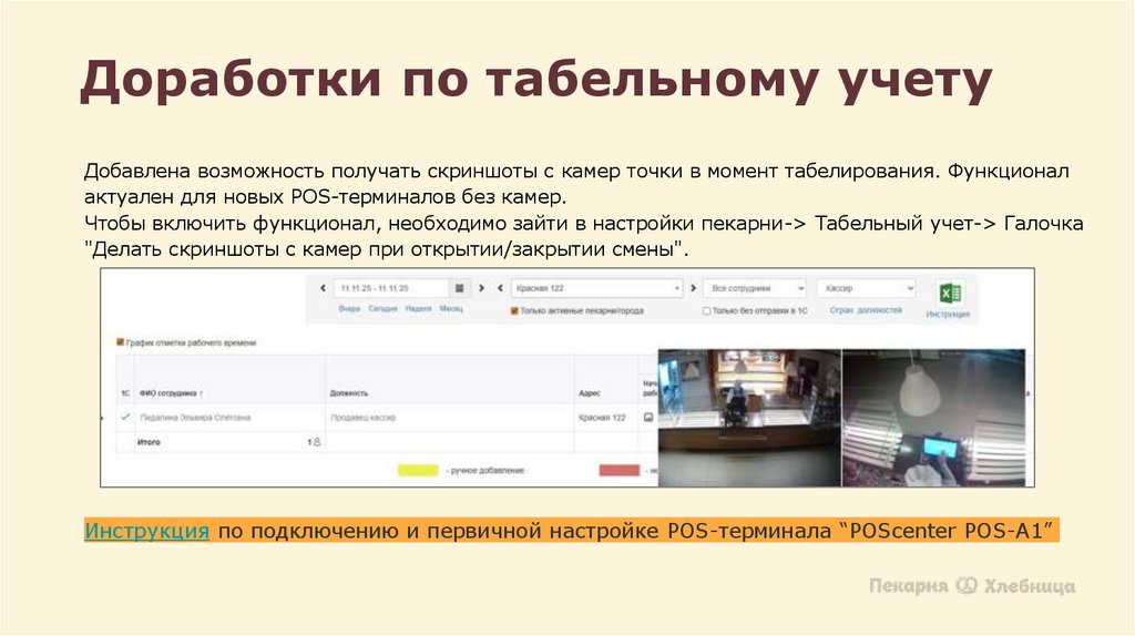 Доработки по табельному учетуДобавлена возможность получать скриншоты с камер точки в момент табелирования. Функционал