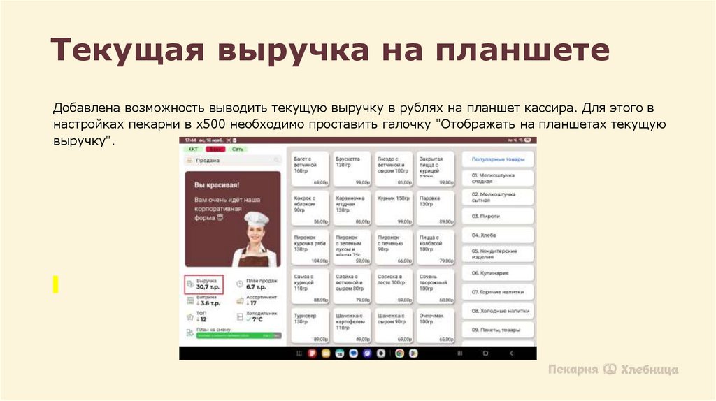 Текущая выручка на планшетеДобавлена возможность выводить текущую выручку в рублях на планшет кассира. Для этого в
