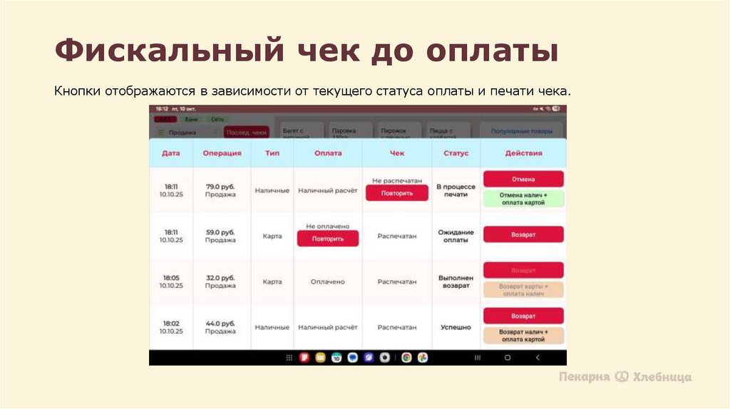 Фискальный чек до оплатыКнопки отображаются в зависимости от текущего статуса оплаты и печати чека.