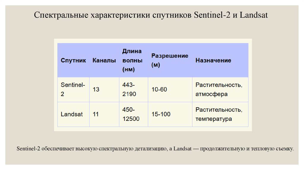 Спектральные характеристики спутников Sentinel-2 и LandsatSentinel-2 обеспечивает высокую спектральную детализацию, а Landsat — продолжительную и тепловую съемку.
