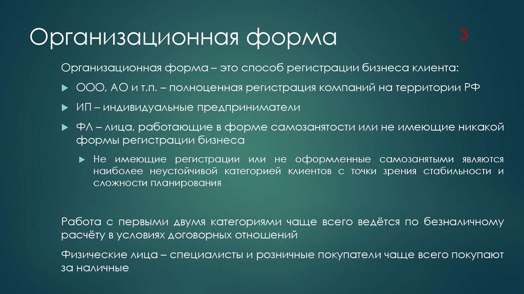 3Организационная форма – это способ регистрации бизнеса клиента: