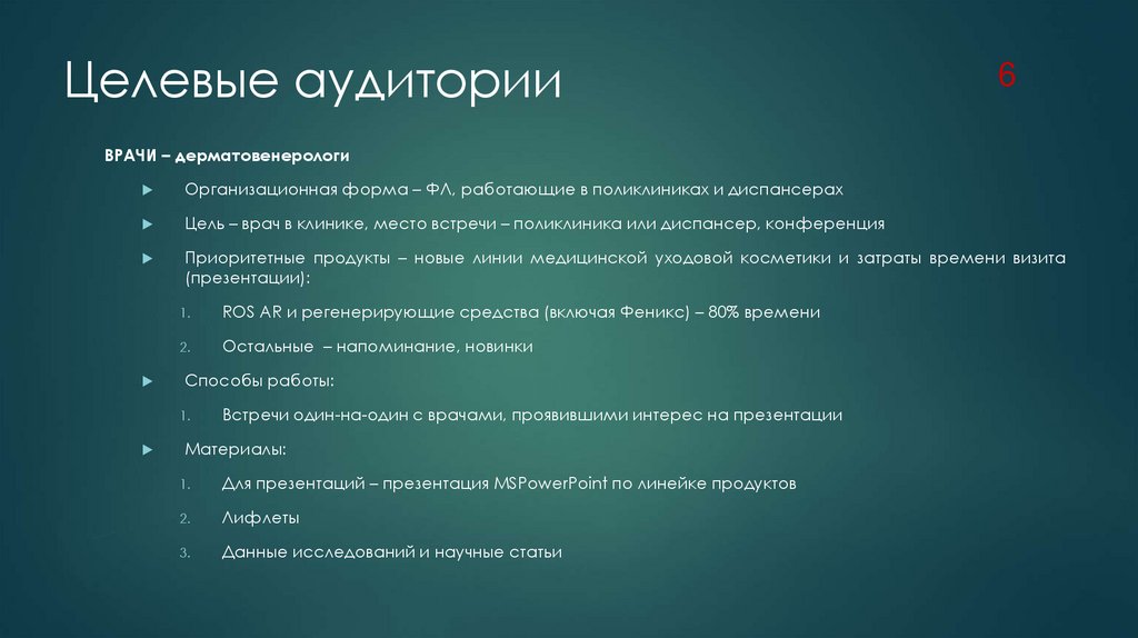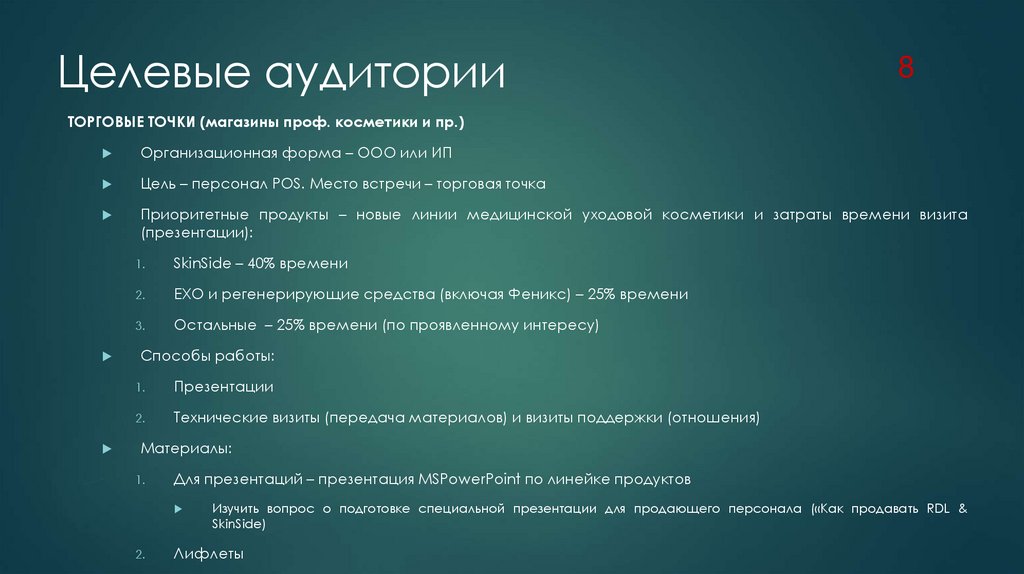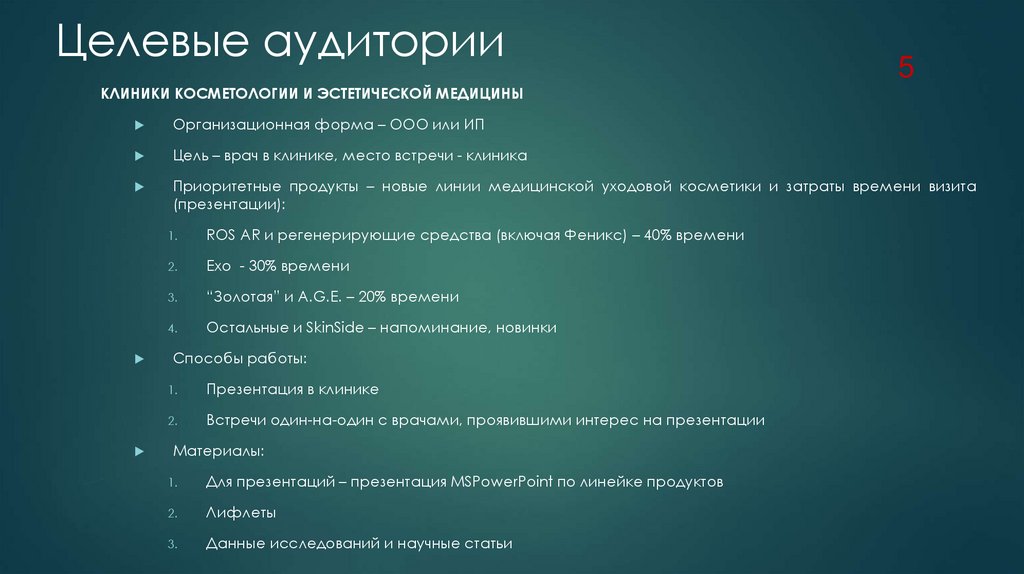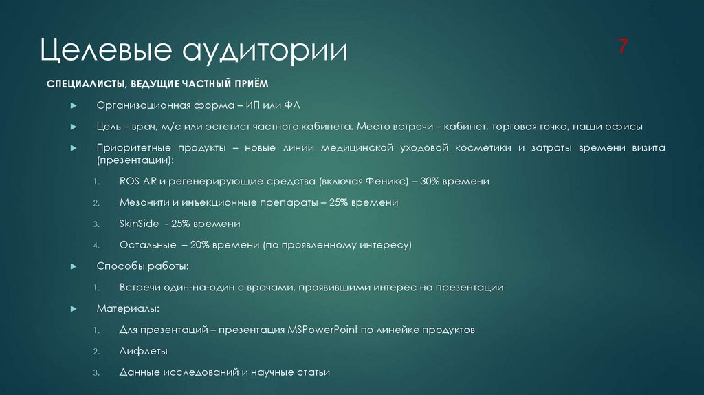 Цель – врач, м/с или эстетист частного кабинета. Место встречи – кабинет, торговая точка, наши офисы