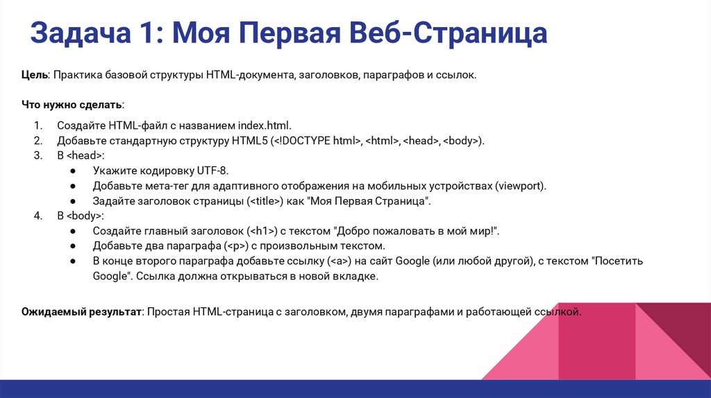 Задача 1: Моя Первая Веб-СтраницаЦель: Практика базовой структуры HTML-документа, заголовков, параграфов и ссылок.