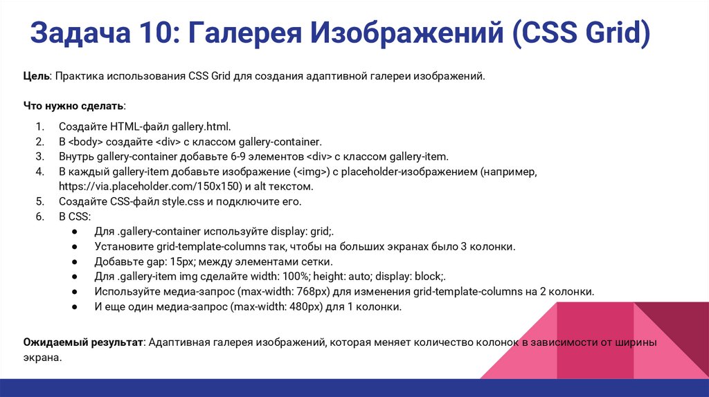 Задача 10: Галерея Изображений (CSS Grid)Цель: Практика использования CSS Grid для создания адаптивной галереи изображений.